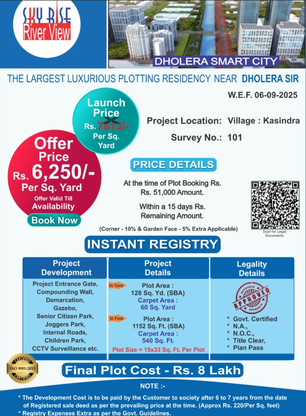 Strategically located near major connectivity routes and key development zones of Dholera, Skyrise River View ensures residents benefit from both natural beauty and urban growth. With Dholera’s rapid transformation into a major economic hub, properties in Kasindra hold strong potential for long-term appreciation.